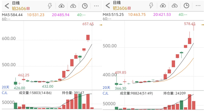 “随着期货价格快速上涨,国内铂现货价格较期货价格贴水从8.9元/克一度扩大至30元/克,钯现货价格较期货价格贴水从30元/克升至85元/克,反映现货市场对当前高价接受度有限,期现价差拉大或带来套利压力。此外,跨市价差亦显著走高,内外价差偏高可能吸引境外资源流入,对国内价格形成压制。”杜鹏提醒称,当前,铂、钯市场情绪过热,投资者需警惕价格快速上涨后的回调风险。
