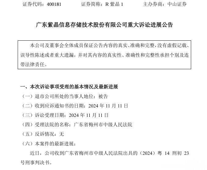 12月12日,已经退市的紫晶存储发布公告称,公司近日收到广东省梅州市中级人民法院出具刑事判决书[(2024)粤14刑初23号],公司实际控制人郑穆、罗铁威及原财务总监李燕霞等10名管理人员,均被判处有期徒刑。