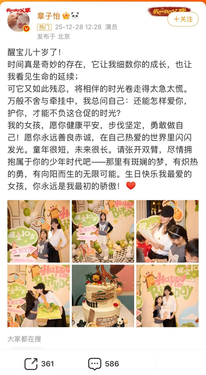 章子怡发了一段长文,并配图祝醒醒十岁生日快乐。