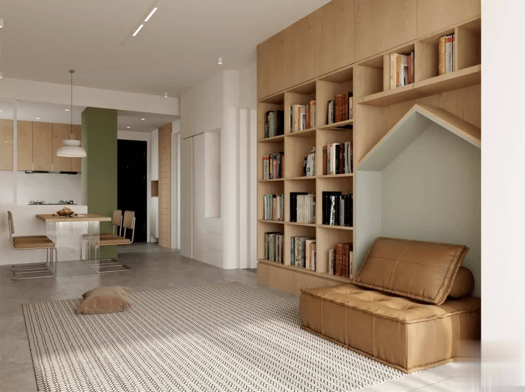 地面材料坚决别选亮面砖,反光性太强,会把顶面的灯具映得一清二楚,让人头晕,优先选柔光砖、仿古砖或木地板,哑光的表面不会反光,和无主灯的搭配度更高。